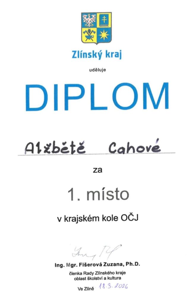 Alžběta Cahová (kvarta) dosáhla mimořádného úspěchu, když zvítězila v krajském kole Olympiády v českém jazyce a zajistila si tak postup do kola celostátního. To se uskuteční v červnu formou týdenního soutěžního soustředění, během něhož účastníci řeší náročné gramatické i slohové úkoly a představí také samostatný mluvený projev.